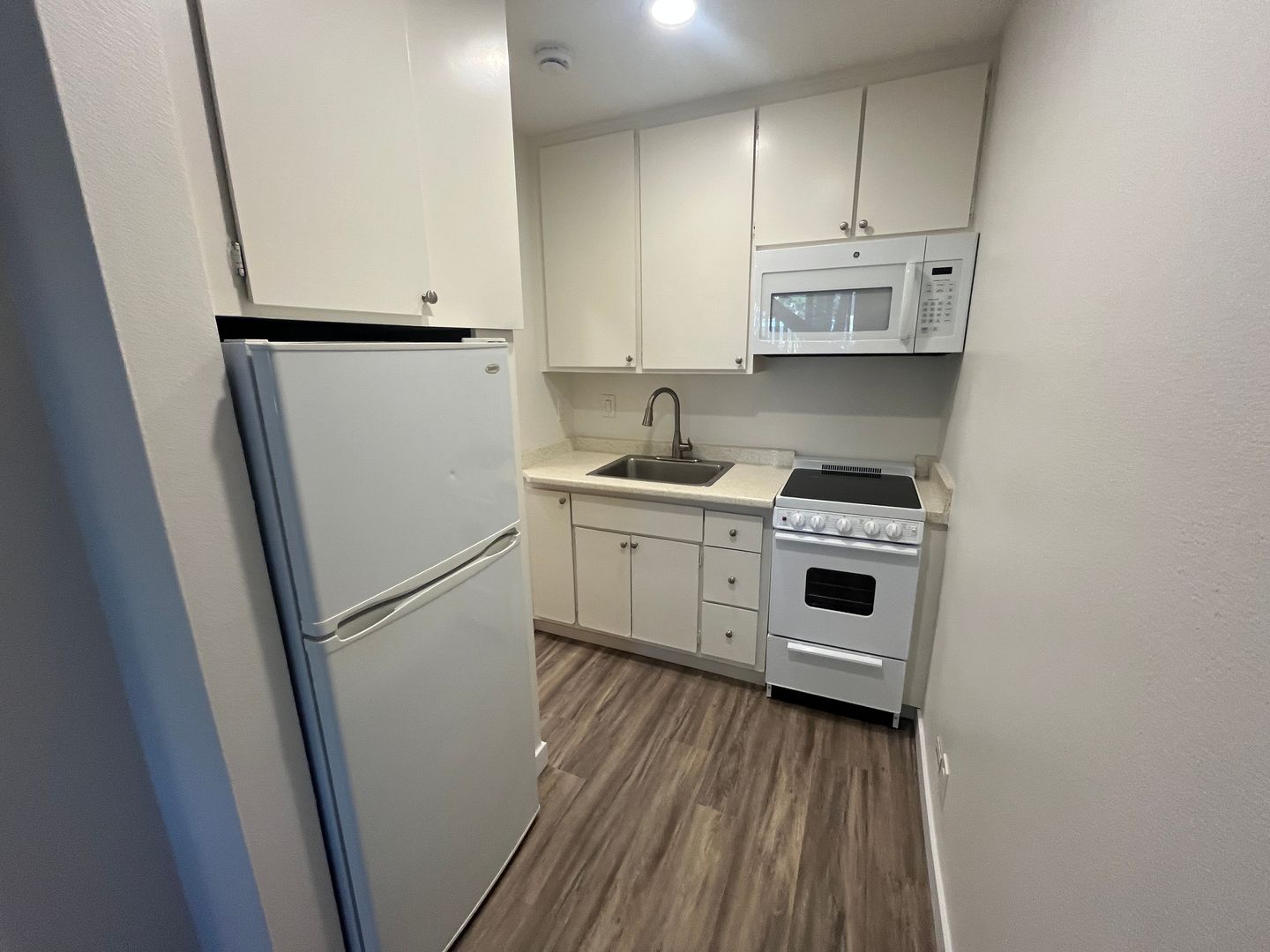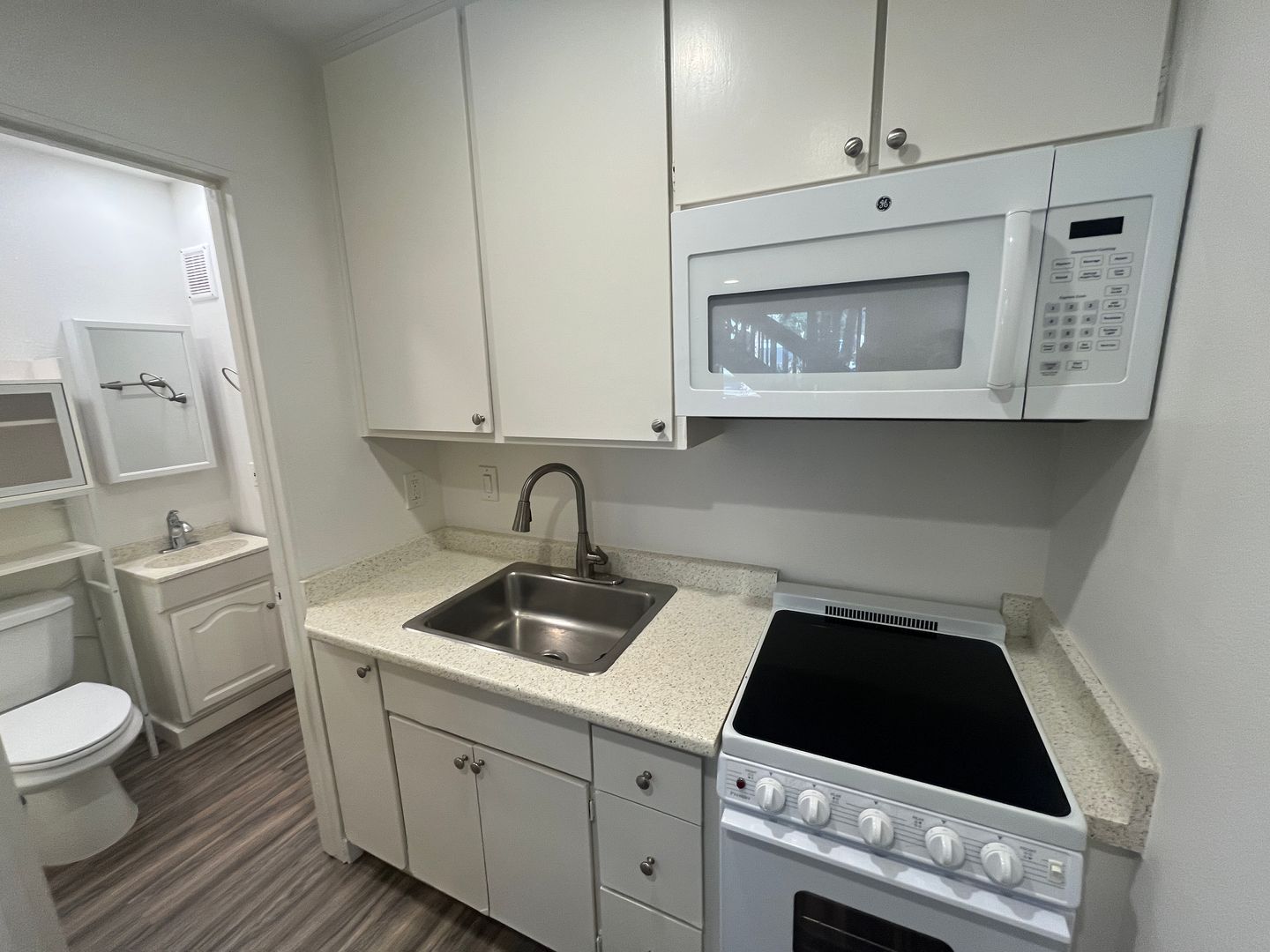 - Refrigerator, built-in microwave, and stove/oven